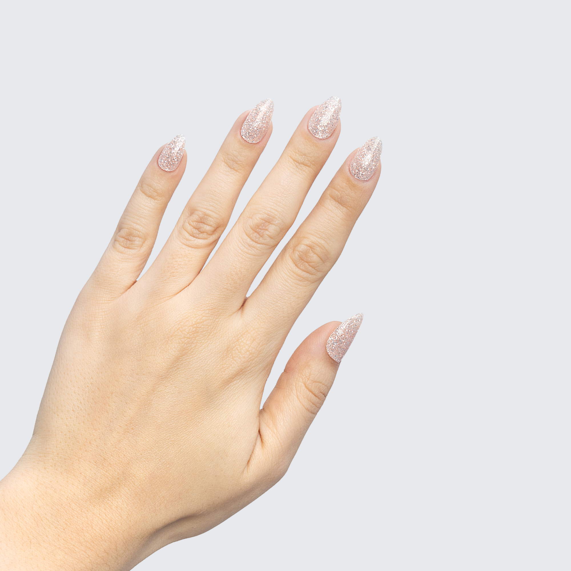 Beige base. Light. Heavy silver glitter. Opaque. Cool undertone.